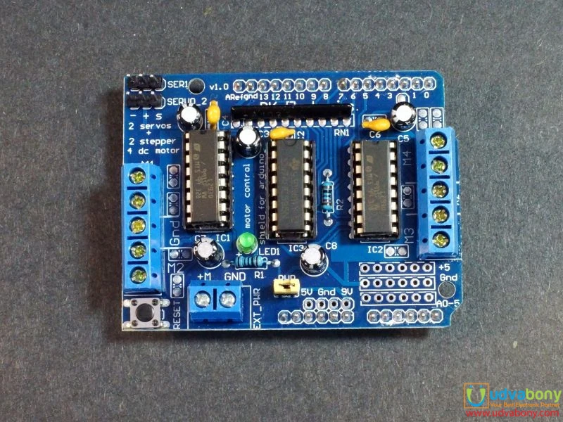 This Arduino compatible motor Driver shield is a full-featured products that it can be used to drive 4 DC motors or two 4-wire stepper and two 5V ”hobby” servo. It drive the DC motor and stepper with the L293D, and it drive the servo with Arduino”s pin9 and pin10.